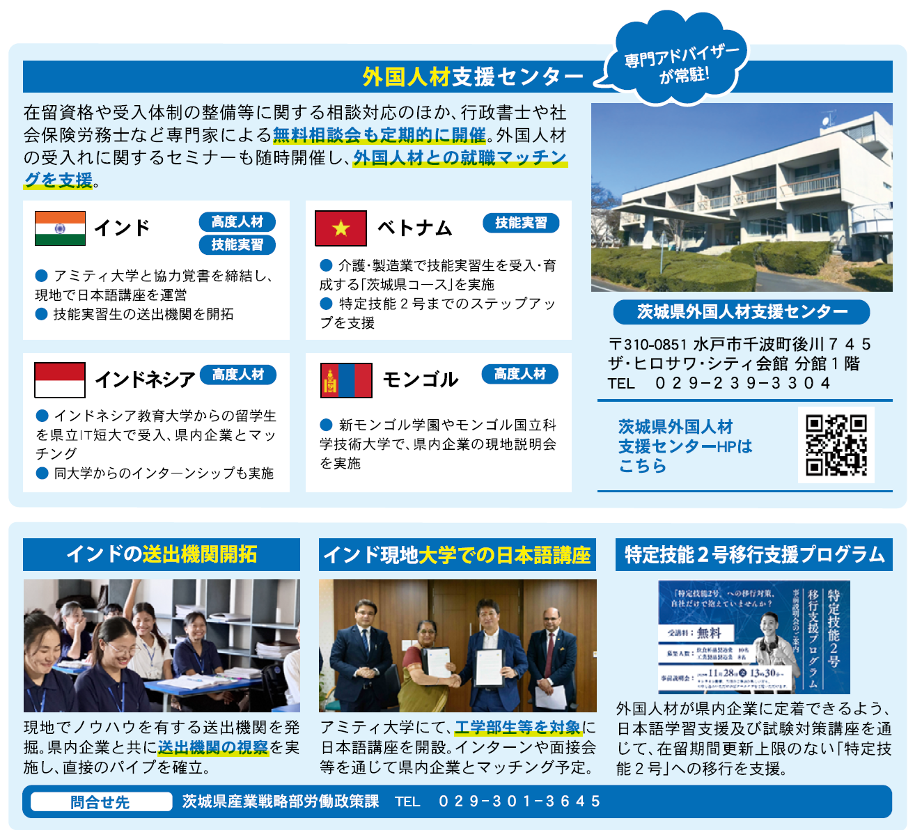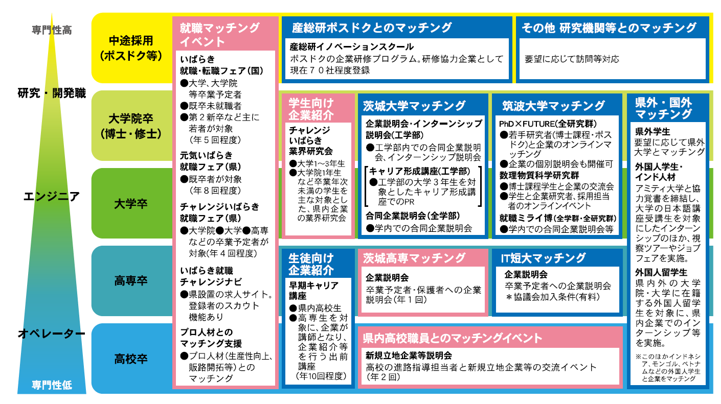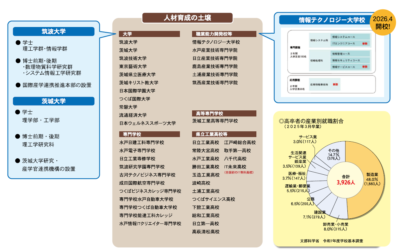 高規格幹線道路網 港湾 空港 人材 生活環境 立地環境 企業の活力を支えるパワー 人材育成 活力と魅力ある県立高校づくり 興味関心事を探究・追究できる教育環境の整備に向け、中高一貫教育校を13校設置※都道府県立学校としての設置数は全国最多! 公募を実施し、校長職へ民間人を採用 人材確保支援の取組 チャレンジいばらき就職フェア ジョブカフェいばらき いばらき就職チャレンジナビ 外国人材確保の取組 ■問い合わせ先 茨城県産業戦略部労働政策課TEL 029-301-3645