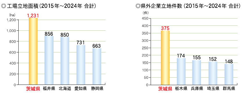 茨城県の過去10年間の企業立地面積1,231haは全国第1位。