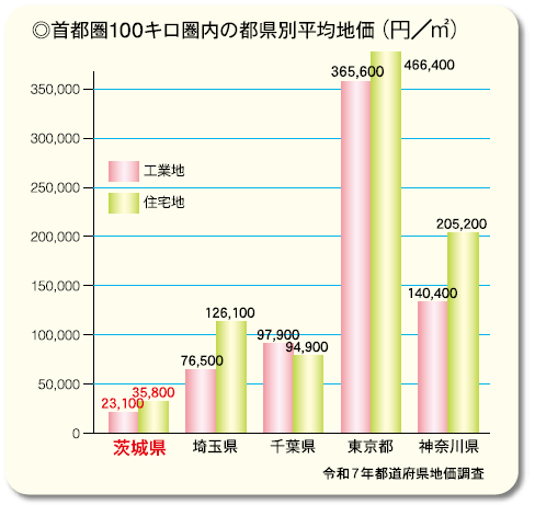 茨城県の工業地平均地価は、神奈川県の約1/6、埼玉県と比べても約1/3です。これは同じ金額でより広い面積が確保できるということにつながります。